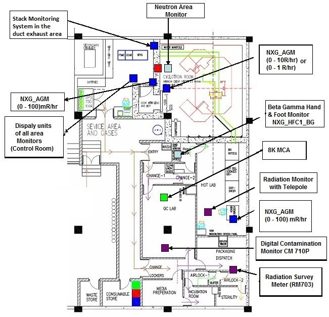 Typical layout map of a Medical Cyclotron Facility, where at Nuclear Instrumentation requirements have been mapped.