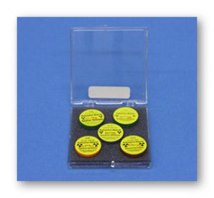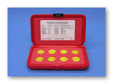 Designed for gamma spectroscopy, the RSS-8 contains eight different gamma emitting isotopes covering the entire energy range from 32 to 1333 keV. Also included in the set is a mixed source of Cs-137 and Zn-65 which students may use to identify an “unknown” isotope. The set consists of Ba-133, Cd-109, Co-57, Co-60, Cs-137, Mn-54. Na-22 and Cs/Zn. Source activities are all 1 uCi, except the Cs/Zn source, which is 0.5 uCi Cs and 1 uCi Zn. Calibrated Gamma Reference Source Set (RSS-8) with certificate can be offered at extra cost.